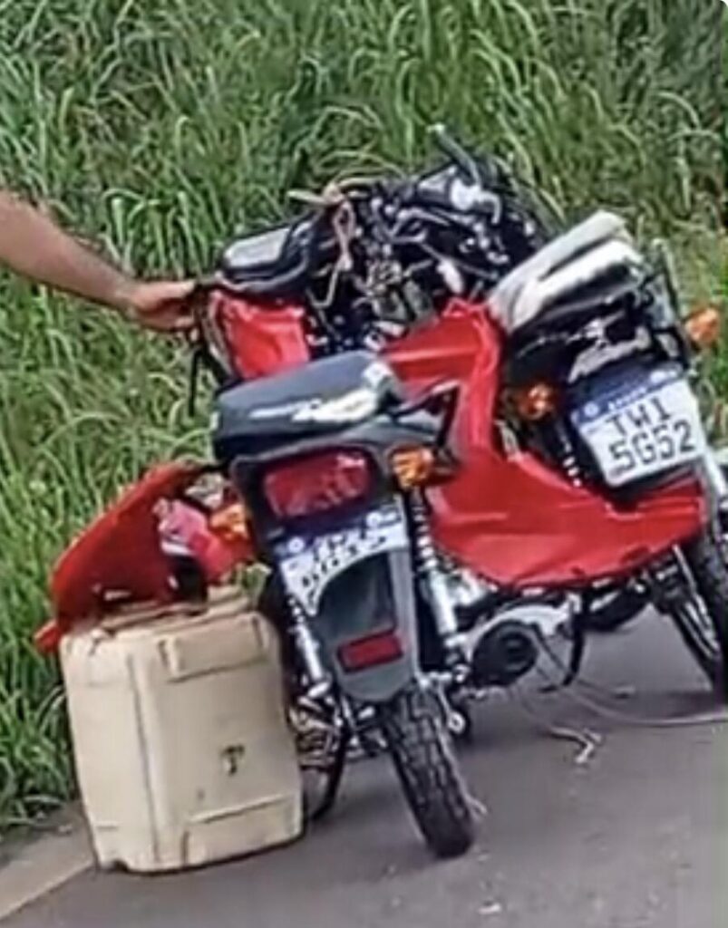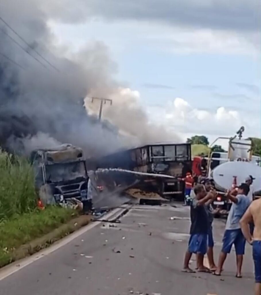 Imagens que circulam nas redes sociais mostram a dimensão do acidente. Em um dos registros, uma das carretas aparece completamente tomada pelas chamas, enquanto a outra está tombada na via, evidenciando a força do impacto. Também é possível observar uma caminhonete capotada sobre a pista e uma motocicleta modelo Honda Pop danificada às margens da rodovia, no entanto, não há confirmação se o veículo de duas rodas está diretamente envolvido na colisão.