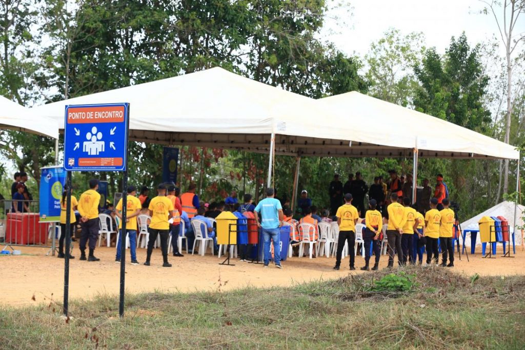 Com o acionamento das sirenes de segurança, os moradores seguiram para os pontos de encontro, onde foram recebidos pelas equipes de suporte da Defesa Civil, parceiros que ofereceram vários serviços, como distribuição de água, espaço de recreação destinado a crianças com pula-pula e piscina de bolinhas, espaço pet com oferta de ração e água para os animais de estimação, além de brindes distribuídos aos participantes.
