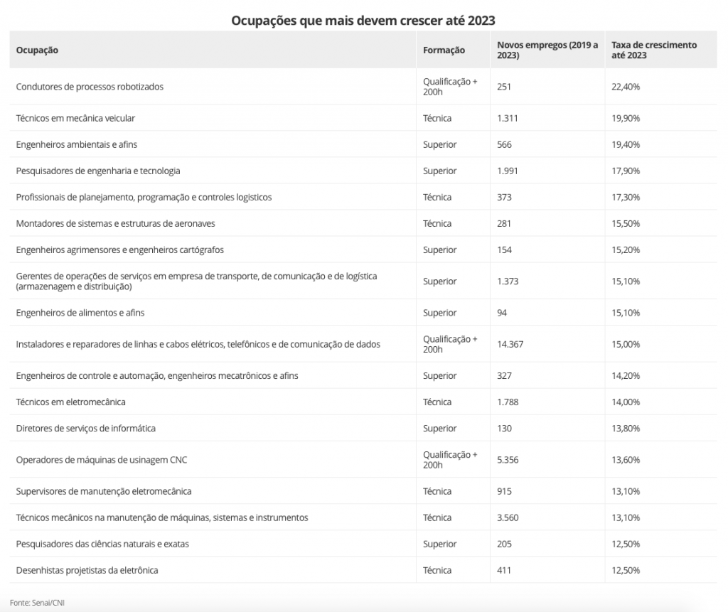 A CNI aponta que, em relação aos novos empregos, as maiores taxas de crescimento devem vir de ocupações que têm a tecnologia como base. Além dos condutores de processos robotizados, estão pesquisadores de engenharia e tecnologia (aumento de 17,9%); engenheiros de controle e automação, engenheiros mecatrônicos e afins (14,2%); diretores de serviços de informática (13,8%); e operadores de máquinas de usinagem CNC (13,6%).