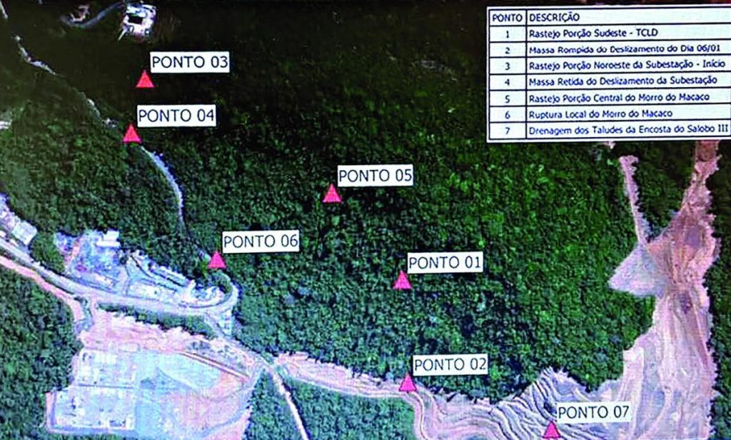 Junto à denúncia, os funcionários da Vale anexaram um mapa para que a situação fosse entendida da melhor forma. De acordo com eles, os pontos 04 e 06, massa retida do deslizamento da subestação e ruptura local do Morro do Macaco, respectivamente, podem atingir toda a área de escritórios onde eles atuam, Emergência Vale e entorno.