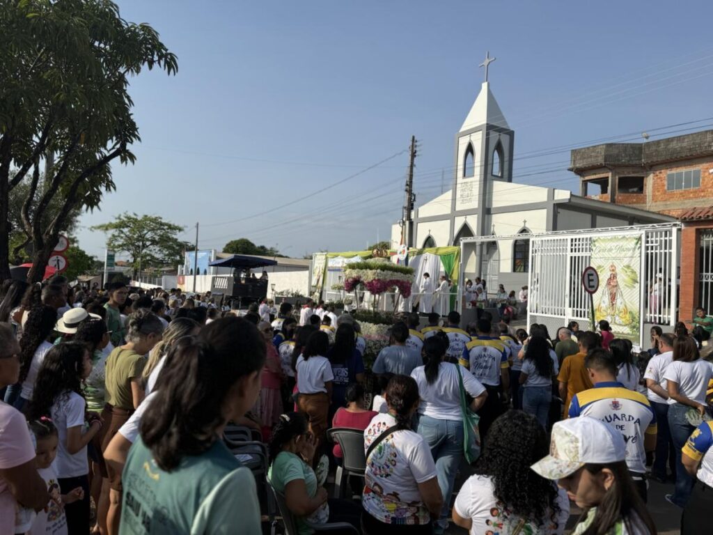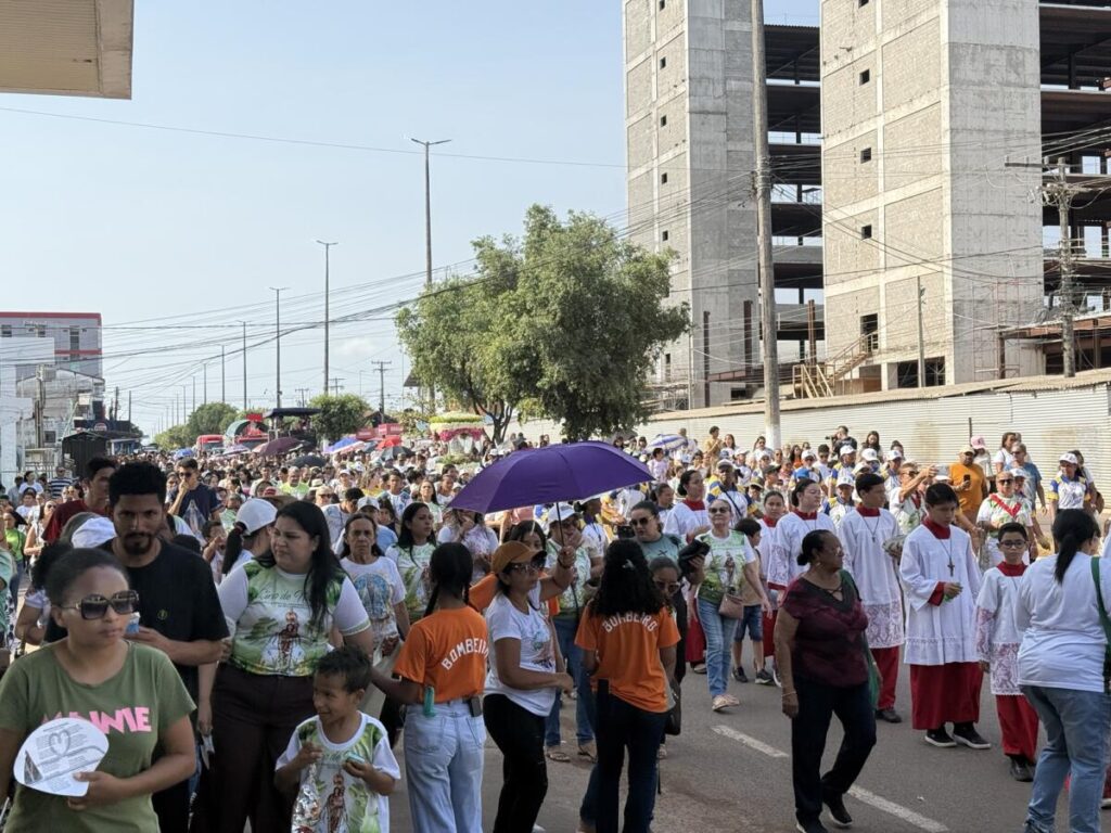 A programação começou às 7h da manhã, com a celebração da Santa Missa na Paróquia Menino Jesus, seguida da romaria, que contou com cânticos, orações e louvores ao longo do percurso.