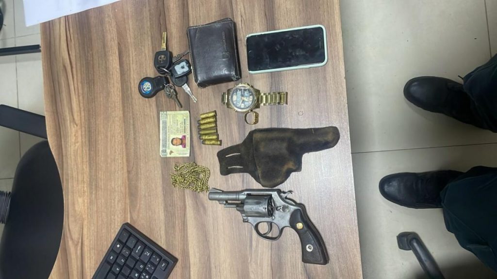 Kleiton Ferreira da Conceição, de 33 anos, foi levado para a Delegacia de Polícia Civil após ameaçar um segurança da Feira Agropecuária de Parauapebas (FAP). Armado, ele estava dirigindo um veículo Parati, de cor preta, quando passou pelo local e apontou a arma em direção ao segurança.