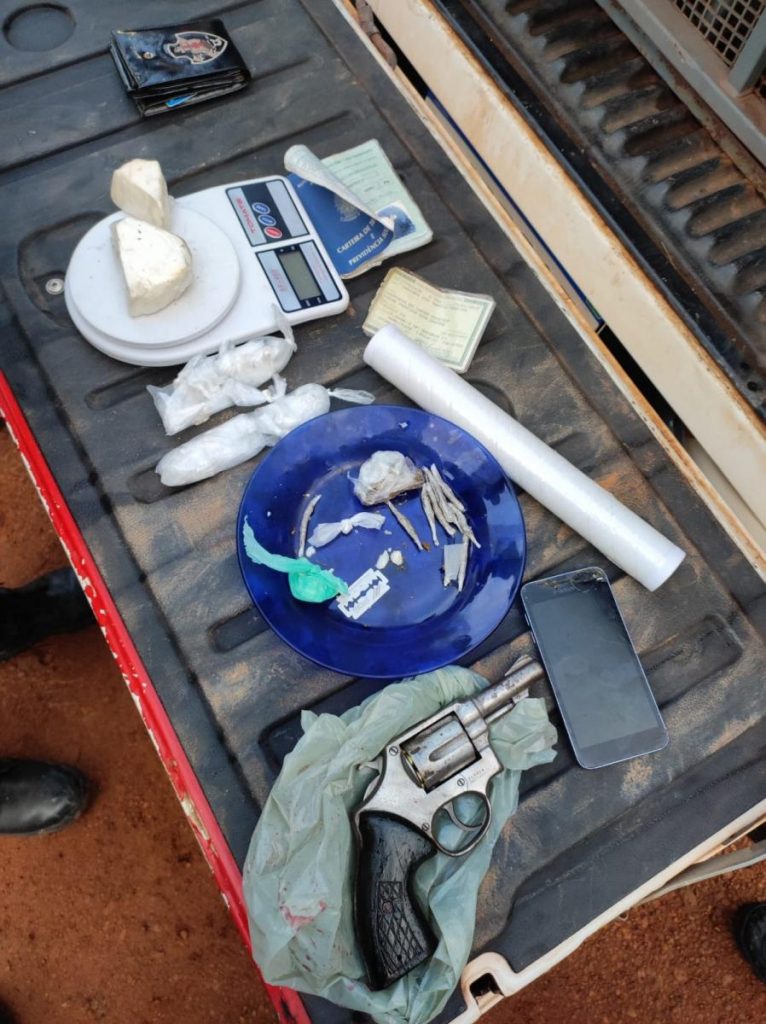 Na residência estava presente também sua namorada, além de documentos do seu cunhado, de nome Romário, que também é foragido da justiça por um duplo homicídio. Foi encontrado ainda grande quantidade de Oxy, balança de precisão, papel para embalo, assim como a arma que estava com o criminoso, que era um revólver calibre 38. Em continuidade, foi apreendido um menor conhecido pelas guarnições da PM devido ser traficante na área, o mesmo estava em posse de entorpecentes.
