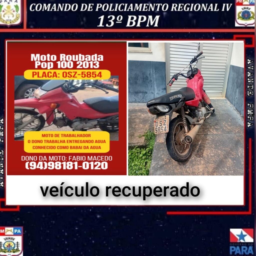 A Polícia Militar recuperou, na manhã de sábado (28), uma motocicleta com registro de furto no bairro Santa Mônica, em Tucuruí.