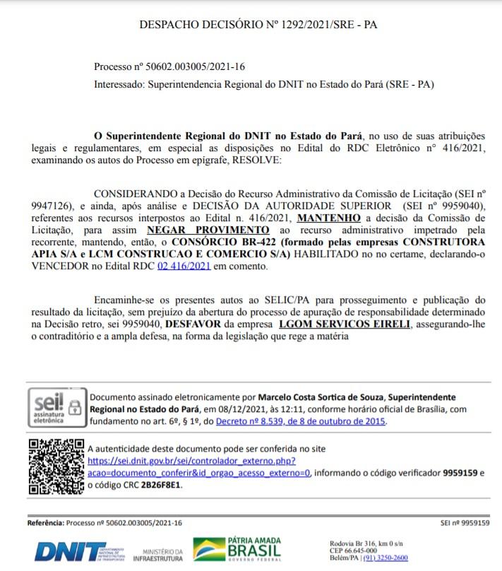 Em novembro duas empresas recorreram do resultado da licitação e a homologação foi adiada e hoje o DNIT publicou a decisão final.