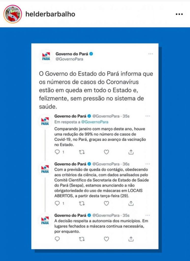 Nas redes sociais o Governador Helder Barbalho publicou que a partir desta terça-feira (29), fica desobrigado o uso da máscara em todo o Estado em ambientes abertos. Ele ainda postou a comparação do número de casos em janeiro do ano passado com o mesmo período de 2022. Confira: