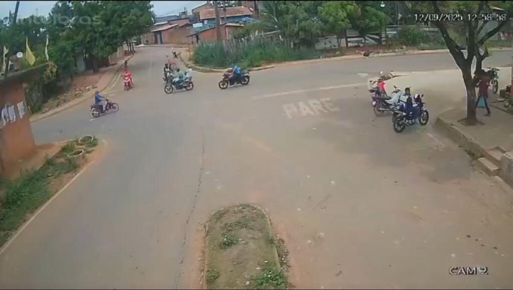 Imagens que circulam nas redes sociais, captadas por uma câmera de monitoramento, mostram o momento em que um dos motociclistas realiza uma ultrapassagem e acaba atingindo o outro veículo que subia a via principal.