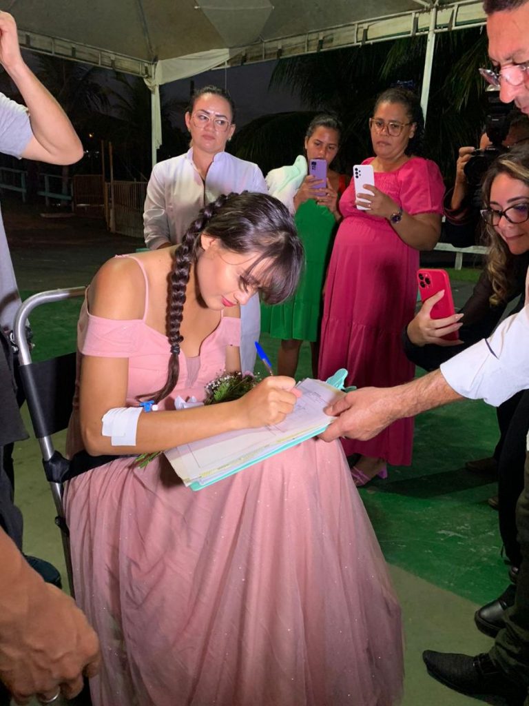 Ruth chegou ao local da cerimônia acompanhada por Walterly e o pequeno Marcos, a bordo de uma ambulância do SAMU, cercada por uma equipe médica atenta a cada necessidade, para garantir que esse momento especial transcorresse com segurança, sem que nada interrompesse a magia da ocasião.