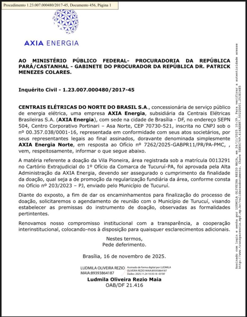 A Centrais Elétricas do Norte do Brasil S.A. — AXIA Energia Norte, subsidiária da Eletrobras — comunicou oficialmente ao Ministério Público Federal (MPF), por meio de manifestação datada de 16 de novembro de 2025, que aprovou internamente a doação da área conhecida como Vila Pioneira, localizada no município de Tucuruí, no Pará. A informação consta em resposta encaminhada ao procurador da República Patrick Menezes Colares, dentro do Inquérito Civil nº 1.23.007.000480/2017-45.