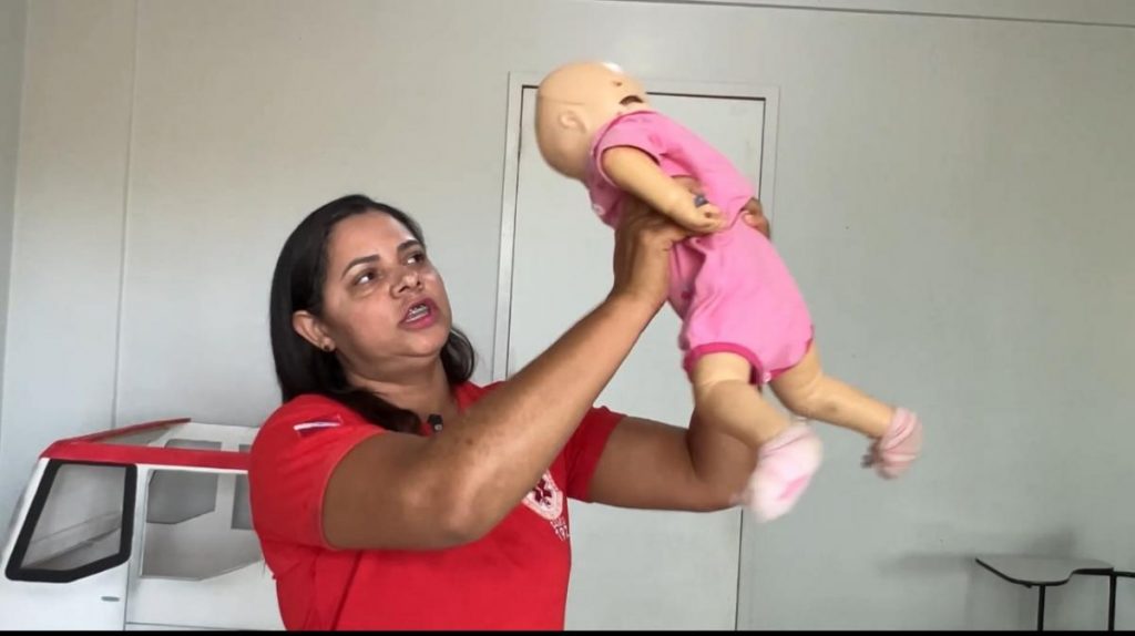 Elisia explicou que, em casos de engasgo, o primeiro passo é verificar se a criança realmente está com obstrução nas vias aéreas. “Uma das indicações de engasgo é quando a criança não consegue chorar, tossir ou emitir sons. Nesses momentos, o tempo é essencial, e é necessário agir com rapidez”, destacou a coordenadora.