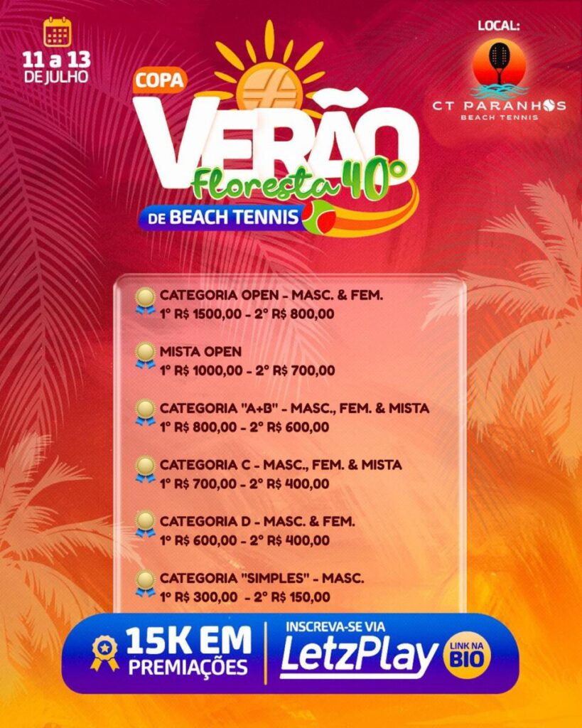 Entre os dias 11 e 13 de julho, os holofotes estarão voltados para o CT Paranhos Beach Tennis, que receberá a 2ª edição da Copa Verão Floresta 40º, um evento que une esporte, energia vibrante e premiações atrativas em um dos locais mais renomados do beach tennis da região — a casa oficial do Amazônia Open 2025.