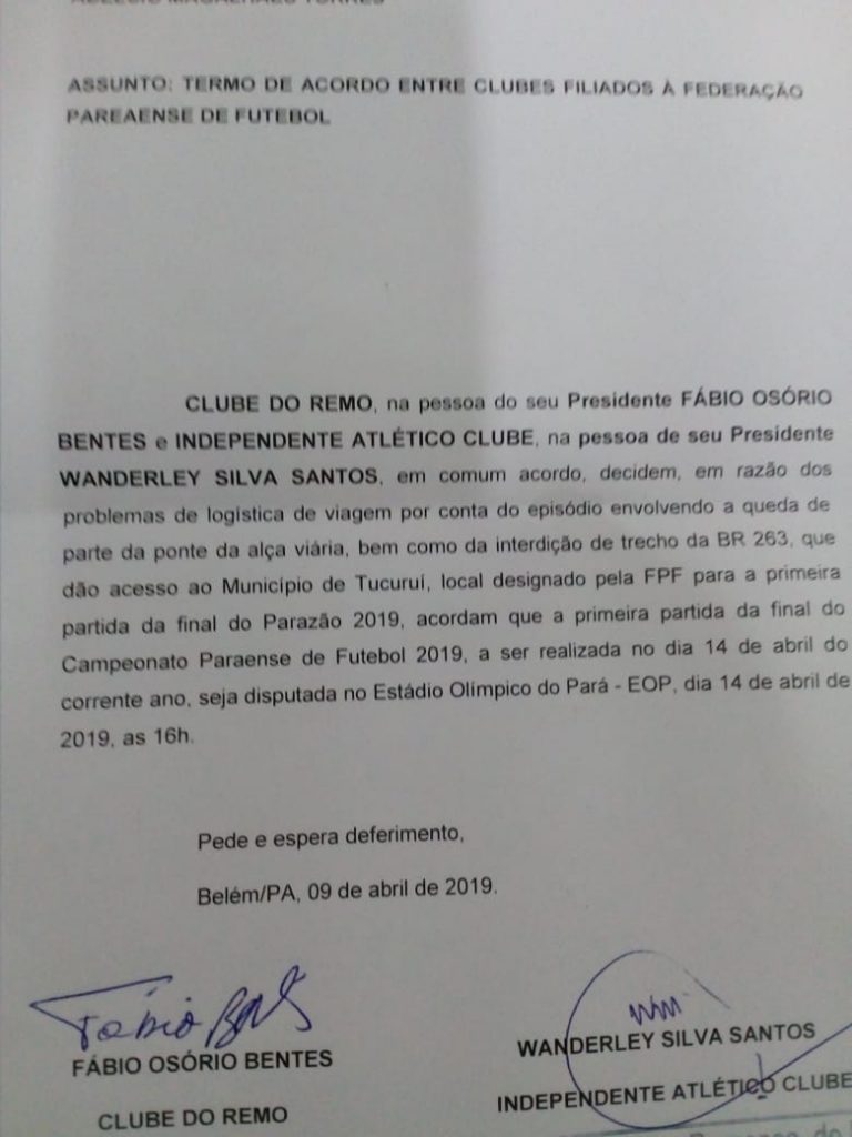Os presidentes do Independente e do Clube do Remo assinam termo de acordo para a realização de jogo na capital. Veja:
