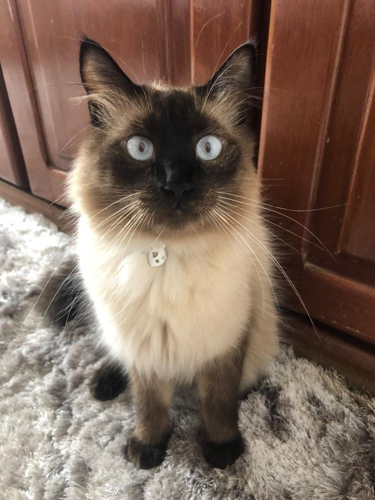 Sid é um gato macho de pelagem cinza e olhos azuis, muito peludo e dócil. Ele usava uma coleira roxa quando desapareceu. Caso você tenha informações sobre o paradeiro do gato Sid, por favor, entre em contato com os donos através do telefone (65) 99607-5115.
