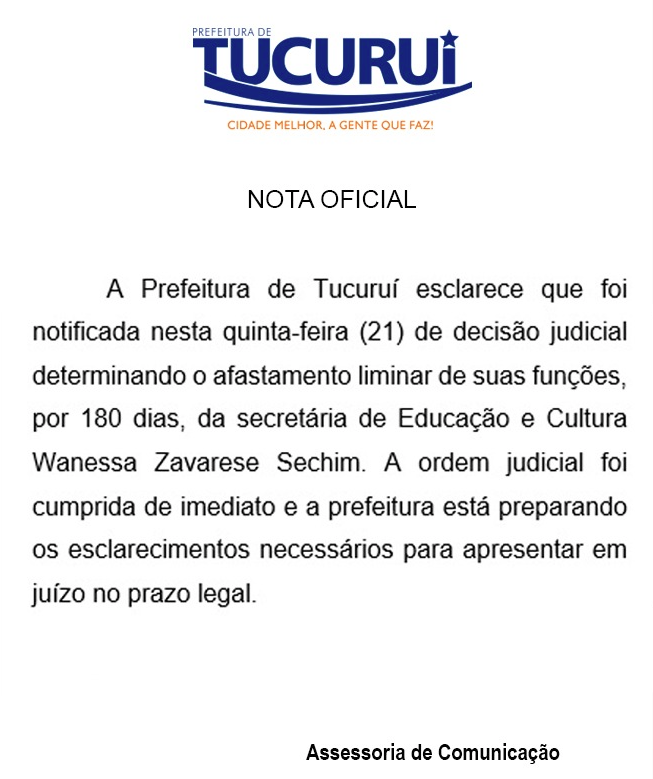 A Justiça afastou por 180 dias do cargo a Secretária de Educação e Cultura do Município de Tucuruí (SEMEC), Wanessa Zavarese Sechim. A decisão atende a um pedido do Ministério Público Estadual através de ação civil por improbidade administrativa.