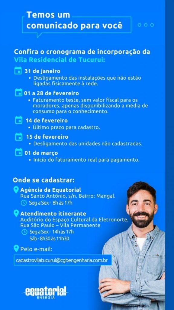 Termina na próxima segunda-feira (14) o prazo para que os moradores da Vila Permanente e do Km 11, façam o cadastro de novos clientes da distribuidora de energia, Equatorial Pará. Quem não tiver um cadastro ativo ficará sem energia elétrica, pois a Eletronorte vai desligar a rede que alimentava esses imóveis no dia 15 de fevereiro.