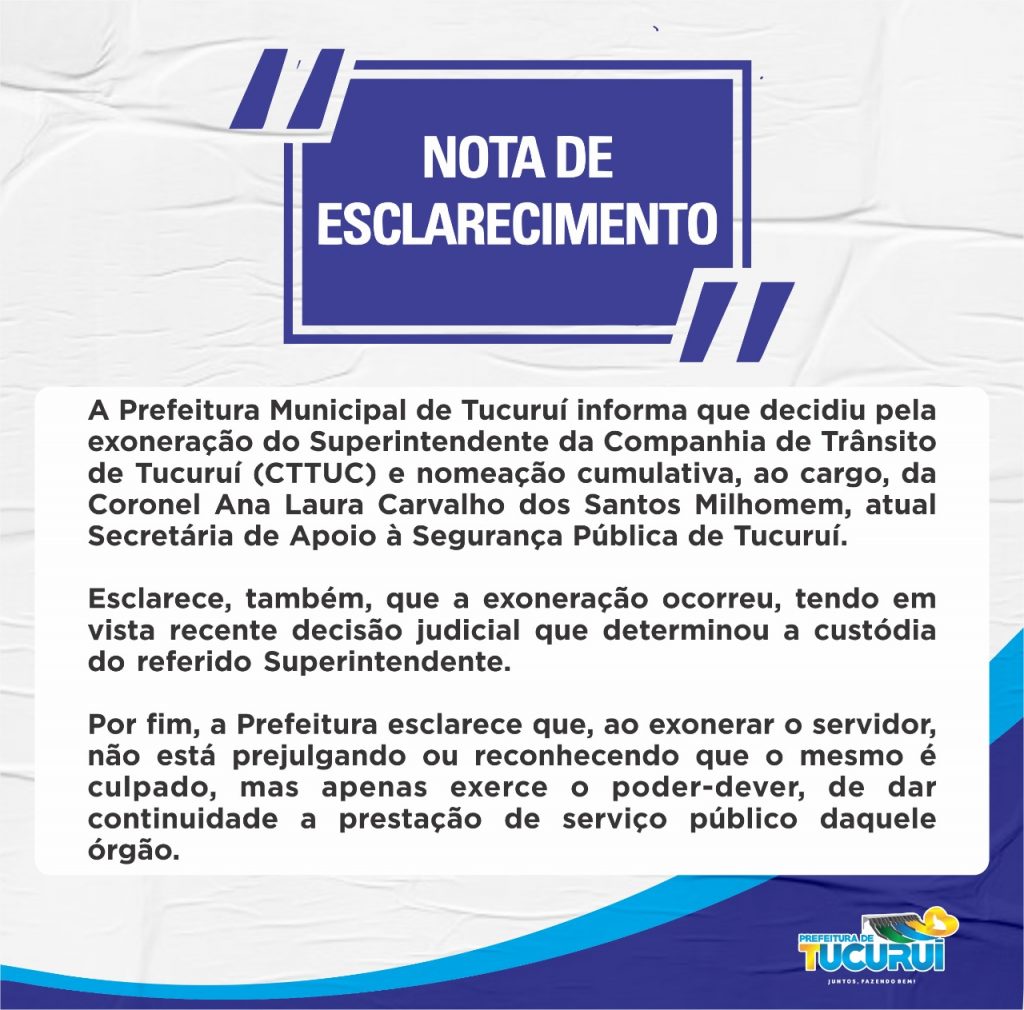 Após a comunicação da prisão de Cristiano Arraes pela Polícia Civil, a Prefeitura de Tucuruí divulgou uma nota oficial, através da assessoria de imprensa, exonerando o Superintendente da CTTUC.