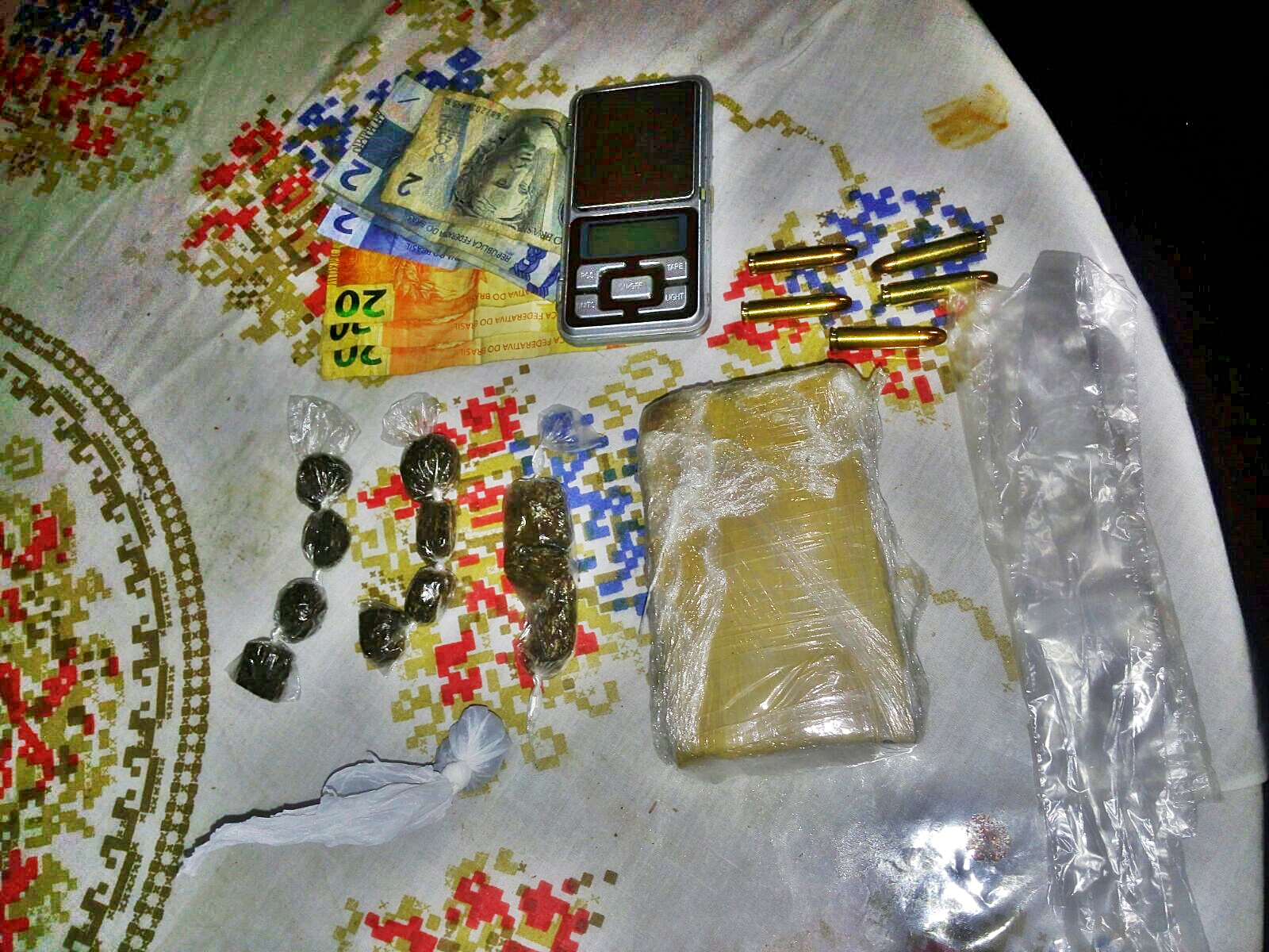 Com eles foram encontrados vários objetos como telefone celular, 1 kg de maconha prensada, 12 papelotes de maconha, 01 balança de precisão digital, 05 munições .30 de uso exclusivo da PM, além de R$ 990,00 em espécie.