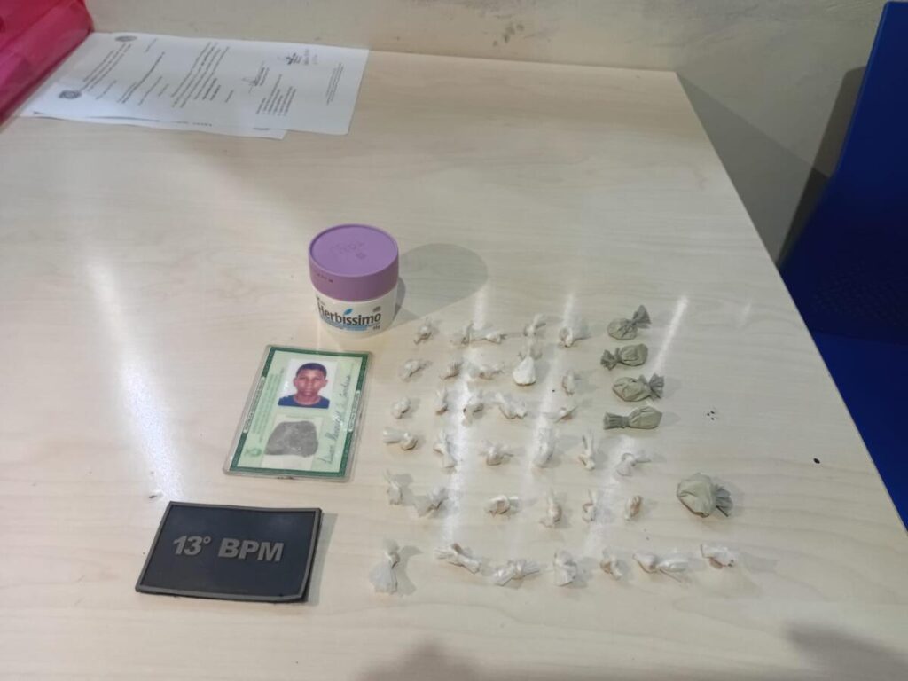 No local, os policiais abordaram um indivíduo identificado como Luan Henrique. Durante a busca pessoal, foram encontrados 39 papelotes de drogas — sendo 4,8 gramas de uma substância semelhante a cocaína e 3,5 gramas de crack.