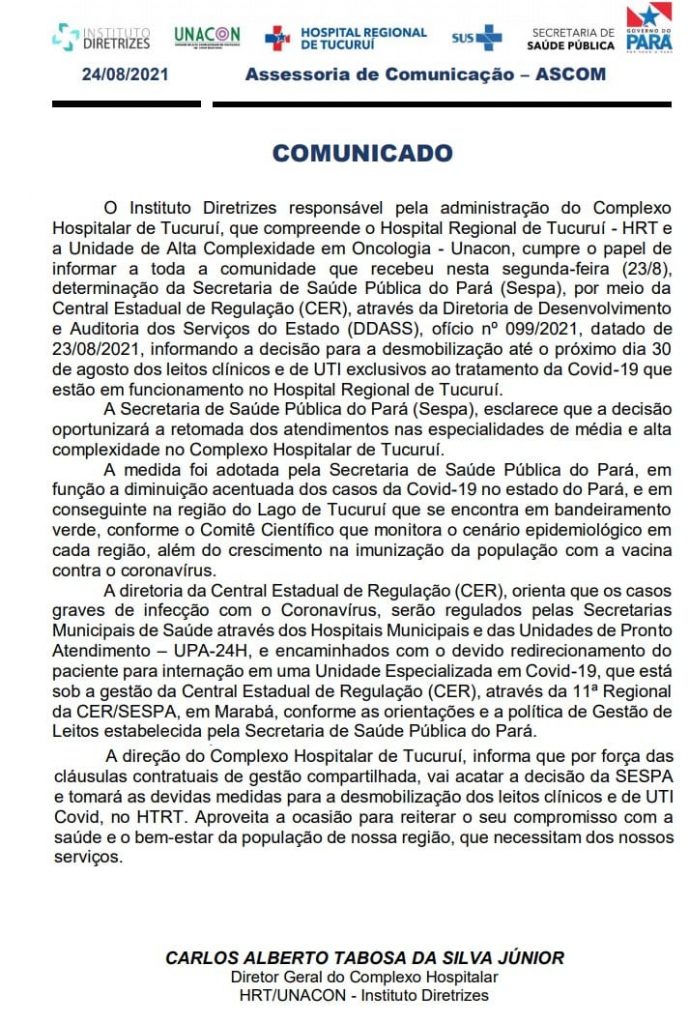 A Secretaria de Saúde Pública do Pará (Sespa), por meio da Central Estadual de Regulação (CER), através da Diretoria de Desenvolvimento e Auditoria dos Serviços do Estado (DDASS), enviou nesta segunda-feira (23/8) ao Instituto Diretrizes responsável pela administração do Complexo Hospitalar de Tucuruí, que compreende o Hospital Regional de Tucuruí – HRT e a Unidade de Alta Complexidade em Oncologia – Unacon, o ofício nº 099/2021, datado de 23/08/2021, informando a decisão para a desmobilização dos leitos clínicos e de UTI exclusivos ao tratamento da Covid-19 que estão em funcionamento no Hospital Regional de Tucuruí.
