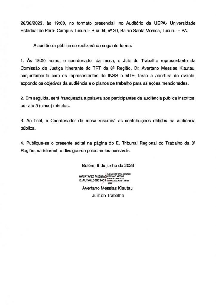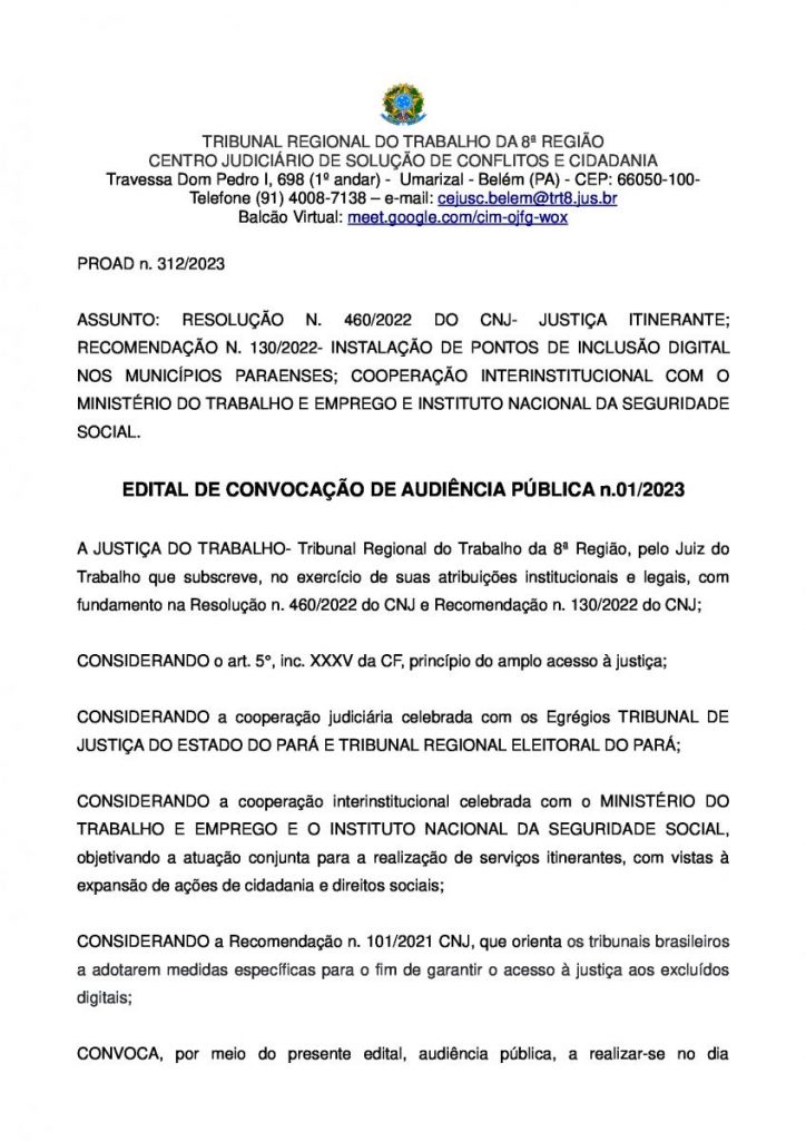 No dia 26 de junho de 2023, o Tribunal Regional do Trabalho da 8ª Região, realizará uma audiência pública com o objetivo de debater a implementação da Justiça Itinerante e a inclusão digital nos municípios paraenses. A convocação para a audiência, regida pela Resolução nº 460/2022 do CNJ e pela Recomendação nº 130/2022 do CNJ, foi emitida pelo Juiz do Trabalho Avertano Messias Klautau.