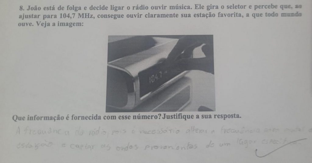 A pergunta trazia a seguinte situação: “João está de folga e decide ligar o rádio para ouvir música. Ele gira o seletor e percebe que, ao ajustar para 104,7 MHz, consegue ouvir claramente sua estação favorita, a que todo mundo ouve. Que informação é fornecida com esse número? Justifique a sua resposta.”