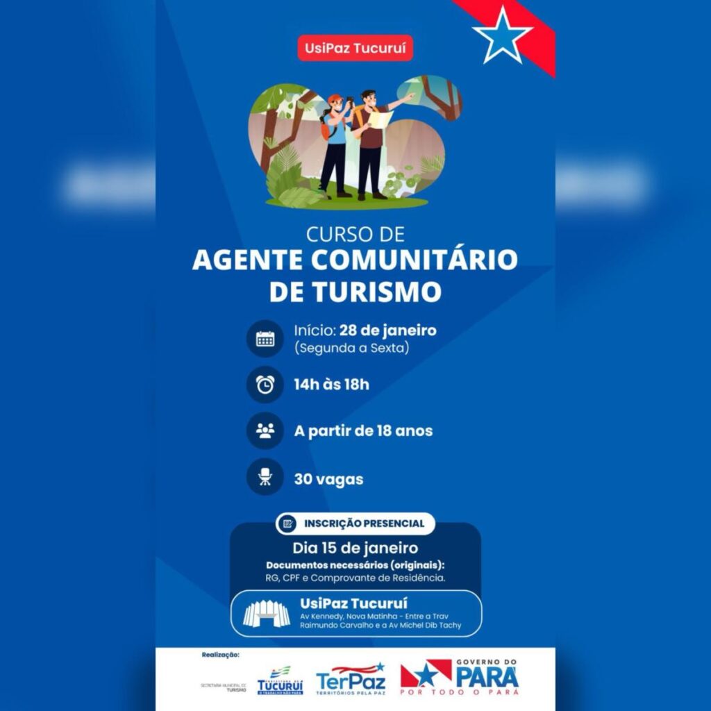 A UsiPaz Tucuruí está com inscrições abertas para o Curso de Agente Comunitário de Turismo, voltado a pessoas a partir de 18 anos interessadas em atuar no fortalecimento do turismo local e comunitário. Ao todo, estão sendo ofertadas 30 vagas.