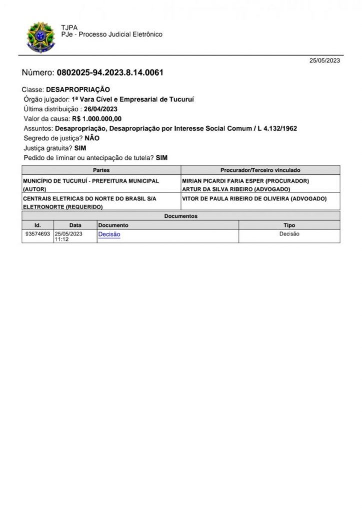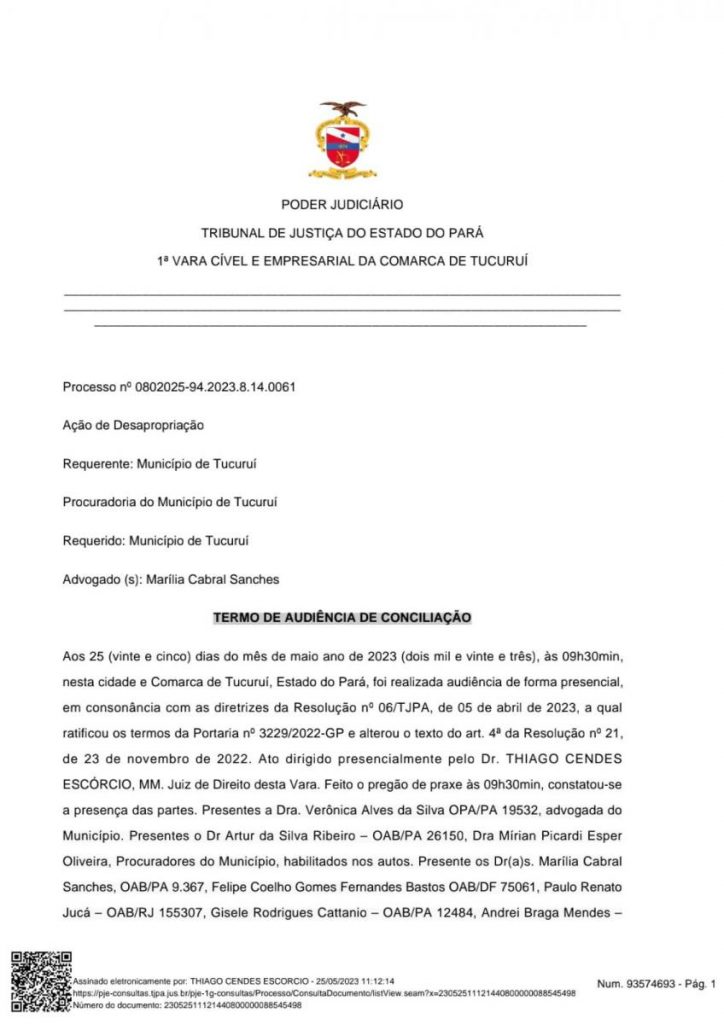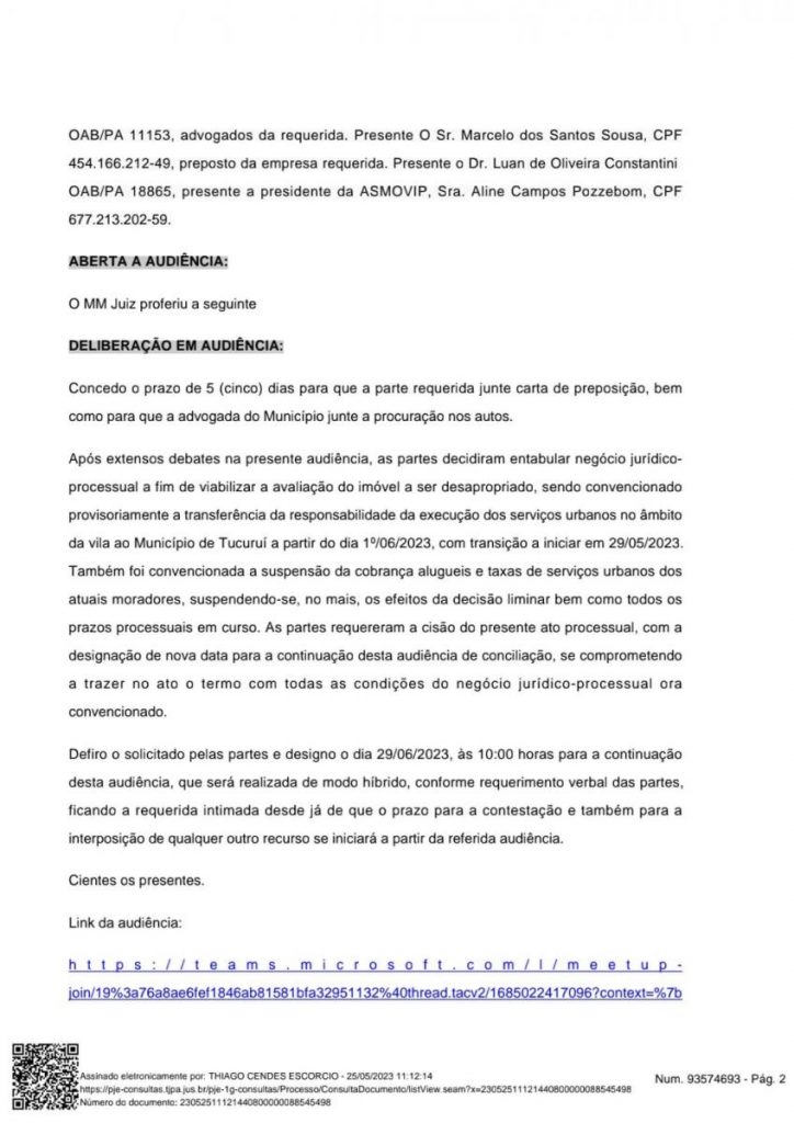 Em audiência de conciliação Eletronorte e Prefeitura de Tucuruí concordam que a partir de 01/06/23 a Prefeitura assume os serviços urbanos da Vila Residencial e os moradores não pagarão aluguéis e taxa de manutenção.